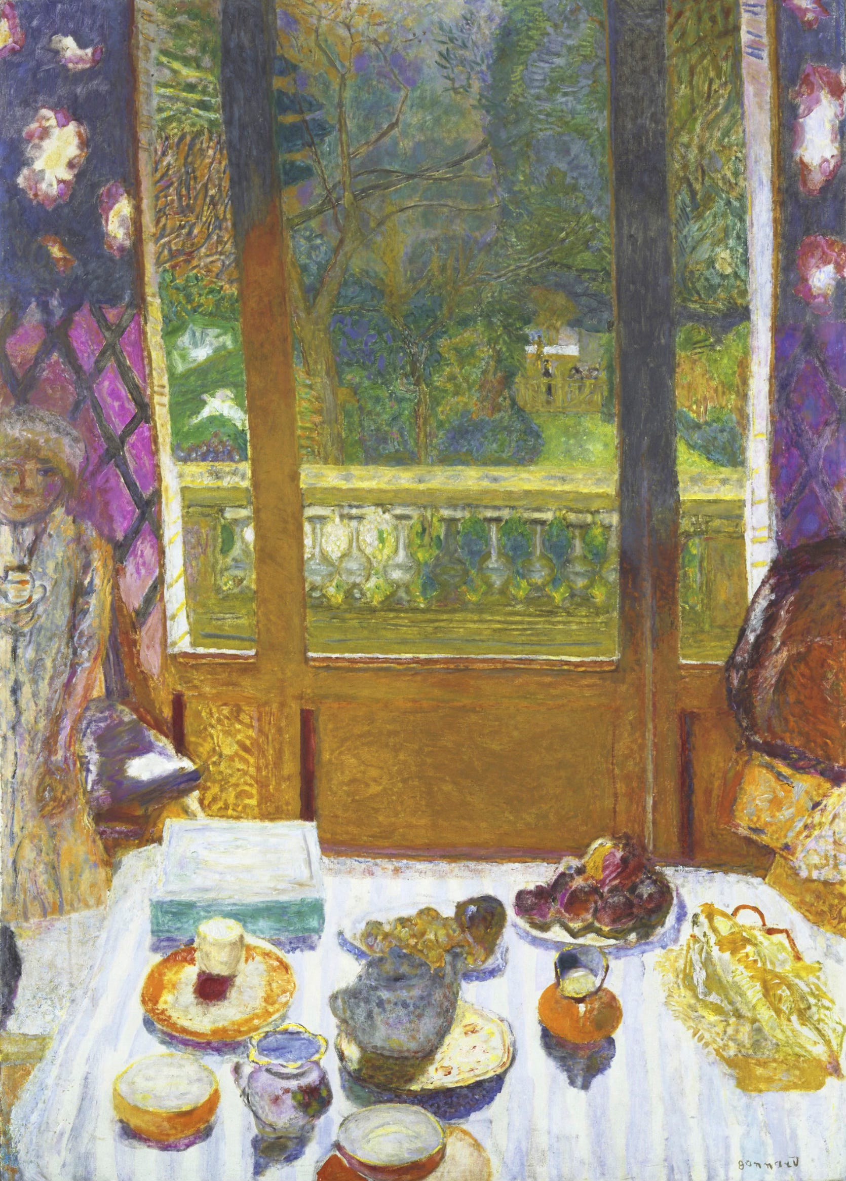 The ice finally broke sometime in the mid 1990s when I happened on The Breakfast Room, a Bonnard interior that resides in the permanent collection at the Museum of Modern Art in New York. It’s a tall vertical canvas in which the golden wainscotting and purple curtains of a provincial interior frame an implausibly saturated, violet, green and blue landscape of trees through a window which takes up the center of the composition, but skewed ever so slightly to the right. At bottom, arrayed on a bright tablecloth bathed in morning sunlight, an assortment of luminous tea cups, pitchers and other breakfast crockery dance toward the lower left corner of the table while a figure — presumably his wife, Marthe — shyly peeks into the frame above.